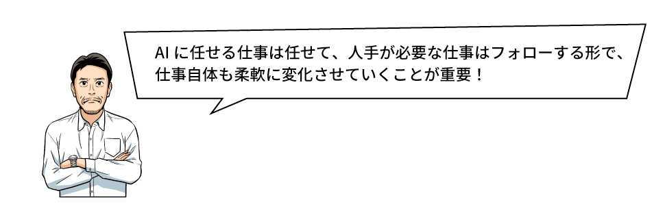 海老原:人材不足を乗り切るためには、それも仕方ないんだよ。ただね、AIにより、セルフ化も高度になって社会は便利になっていくはずだ。再説するけど、AIは「コンピュータ内で完結する仕事」に向いている。つまり、事務的作業は代替可能性が高い。