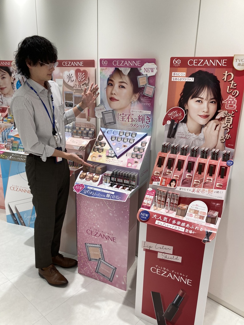 セザンヌ化粧品の営業としてバラエティショップとEC企業を担当しています。バイヤーに毎月の商談で新商品のご紹介やプロモーションをご提案したり企業の大規模なイベントの打ち合わせを行っております。また、各店舗を巡回して販促物・新商品のご紹介・お客様が商品を購入したくなるような売り場づくりのフォローやイベントの企画・設営・結果報告をしています。