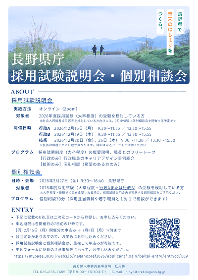 2026.1.16 長野県職員採用試験説明会・個別相談会の情報を公開しました。