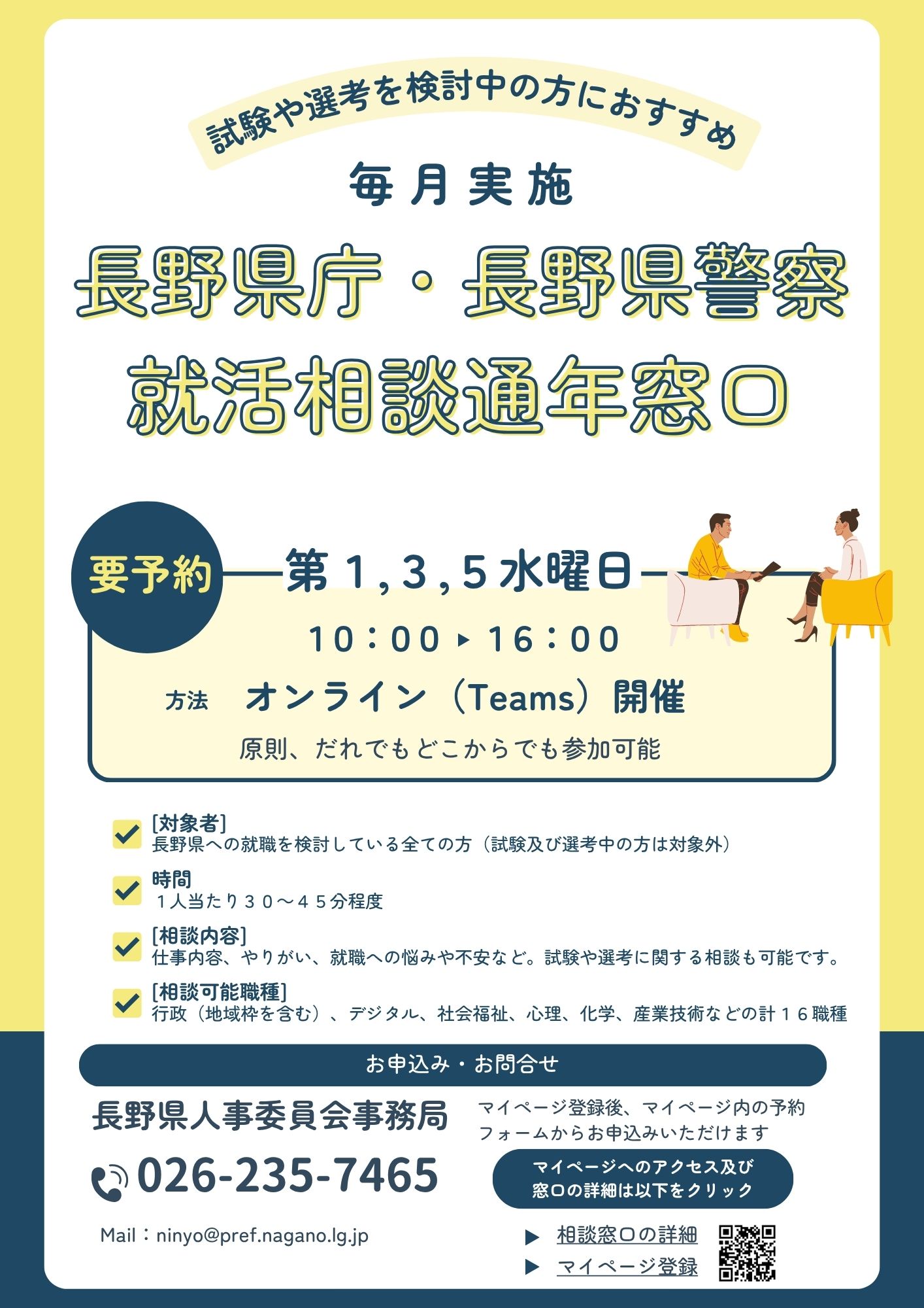長野県庁及び長野県警察への就職を検討している方を対象にした通年相談窓口を開設しています。