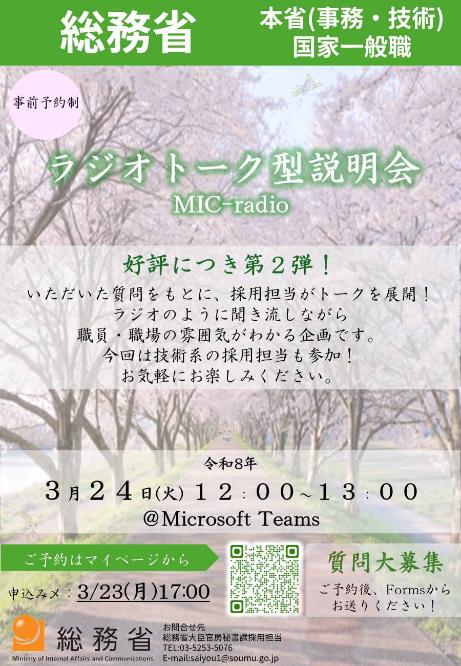 総務省マイページ内の「第2弾!MICラジオ!(ラジオトーク型説明会)【国家一般職・採用担当】」よりご予約ください。