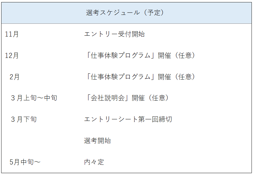 東武百貨店 新卒採用情報 ENTRY / MY PAGE >> TOP 会社を知る 人を知る 採用情報 イベント情報 Q&A 選考 内定後 配属 新入社員研修 その他(休日、制度等) 選考について 選考を受けるにはどうしたらよいですか? 当社マイページ(公開までもうしばらくお待ちください。)または就活サイト「マイナビ2027」「キャリタス就活」当社ページよりエントリーをお願いいたします。エントリーされた方を対象に、「エントリーシート」のご案内を順次お送りいたします。 応募資格や選考スケジュールを教えてください。 「募集要項」をご覧ください。 また、下記選考スケジュールをご覧ください。 ※エントリーされた方を対象に、順次、エントリーシートのご案内をマイページからいたします。※採用選考において皆様よりお預かりする書類につきましては、合否に関わらず返却いたしませんので、予めご了承ください。 ※内々定後は、安心して入社を迎えられるよう、様々なフォローを行っていきます。 どのような人材を求めていますか? 「新ターミナル百貨店実現」のために、スピード感を持って自ら新しいことにチャレンジしていく人材です。詳細は「キャリア」をご覧ください。 会社説明会は行いますか? エントリーいただいた方を対象に2026年3月上旬より実施予定です。詳細につきましては、当社マイページまたは就活サイト「マイナビ2027」、「キャリタス就活」当社ページをご確認ください。 内定後について 内々定後、入社までにどのようなフォローがありますか? 東武百貨店では、内定者の方が当社への理解をさらに深め、また社会人としての準備を整えて入社の日を迎えられるよう、様々なフォロー体制を整えています。 配属について 勤務地はどこになりますか?転勤はありますか? 原則、池袋本店または船橋店での勤務となります。人事異動による店舗間の異動はありますが、両店とも首都圏に立地しているため、転居を伴うものではありません。※総合職採用では、「両店(池袋本店・船橋店)ともに勤務可能な方」を応募資格の一つとしています。 入社後、新入社員としてどのような部署に配属になりますか? 新入社員は売場配属となります。ちなみに、2025年度新入社員は食品や婦人洋品雑貨、紳士用品雑貨、リビング・子供売場、に配属となりました。その後、本人の適性に応じて、売場での管理・運営業務や商品企画業務、バックオフィスでの販売促進、催事企画、テナントリーシング、経営企画、総務、人事等の幅広いフィールドで将来を担う基幹社員としてキャリアを積んでいきます。 新入社員研修について 新入社員研修はどのような内容ですか? 1年を通じて、以下のOFF-JT(集合研修)を予定しています。併せて、マンツーマン指導者によるOJTも実施いたしますので、業務遂行上、わからない点をすぐに解決できる環境が整っています。 下記、「新入社員研修の内容」をご覧ください。 その他(休日、制度等) 1日の勤務時間を教えてください。 売場部門の勤務時間例:実働時間は7時間30分(休憩90分)早番9:45~18:45、中番10:15~19:15、遅番11:10~20:10の交代制(※シフト時間は部門により異なります。) 休日や早番・遅番はどのように決まりますか? 係長や主任が中心となって、お客様の多い日や売場でのイベント運営体制を考えながらスケジュールを組みます。休みやシフトの希望については、事前の申告をもとに、職場内で調整します。 連休を取ることはできますか? 1年を上期(3月11日~9月10日)、下期(9月11日~翌年3月10日)に分け、各期に8日間の連続休暇が取得できます。(※4日連続休暇での分割取得も可)この連続休暇とは別に、挙式前後に連続8日間の有給休暇が取得できる「結婚休暇」や、20年・30年勤続者に対する「リフレッシュ休暇制度」もあります。 育児や介護を支援する制度などはありますか? 出産、育児、介護等、社員をバックアップする制度を導入しています。 新入社員・若手社員出演!WEBセミナー動画公開 当社社員出演中!百貨店協会ムービー公開 TOP 会社を知る 人を知る 採用情報 イベント情報 東武百貨店 © Tobu Department Store Co., Ltd.